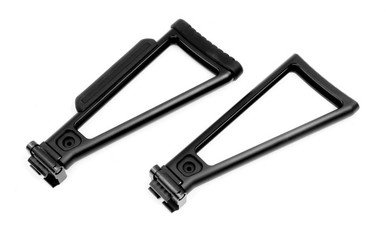 The A3 Tactical Skelestocks are fixed length folding skeleton stocks machined completely from 6061 aluminum. They are available in two lengths: 9.50″ and 11.00″. They are also available with 2 different hinge options. The hinges fold right or left depending on how you mount the hinge. See hinge details below.
