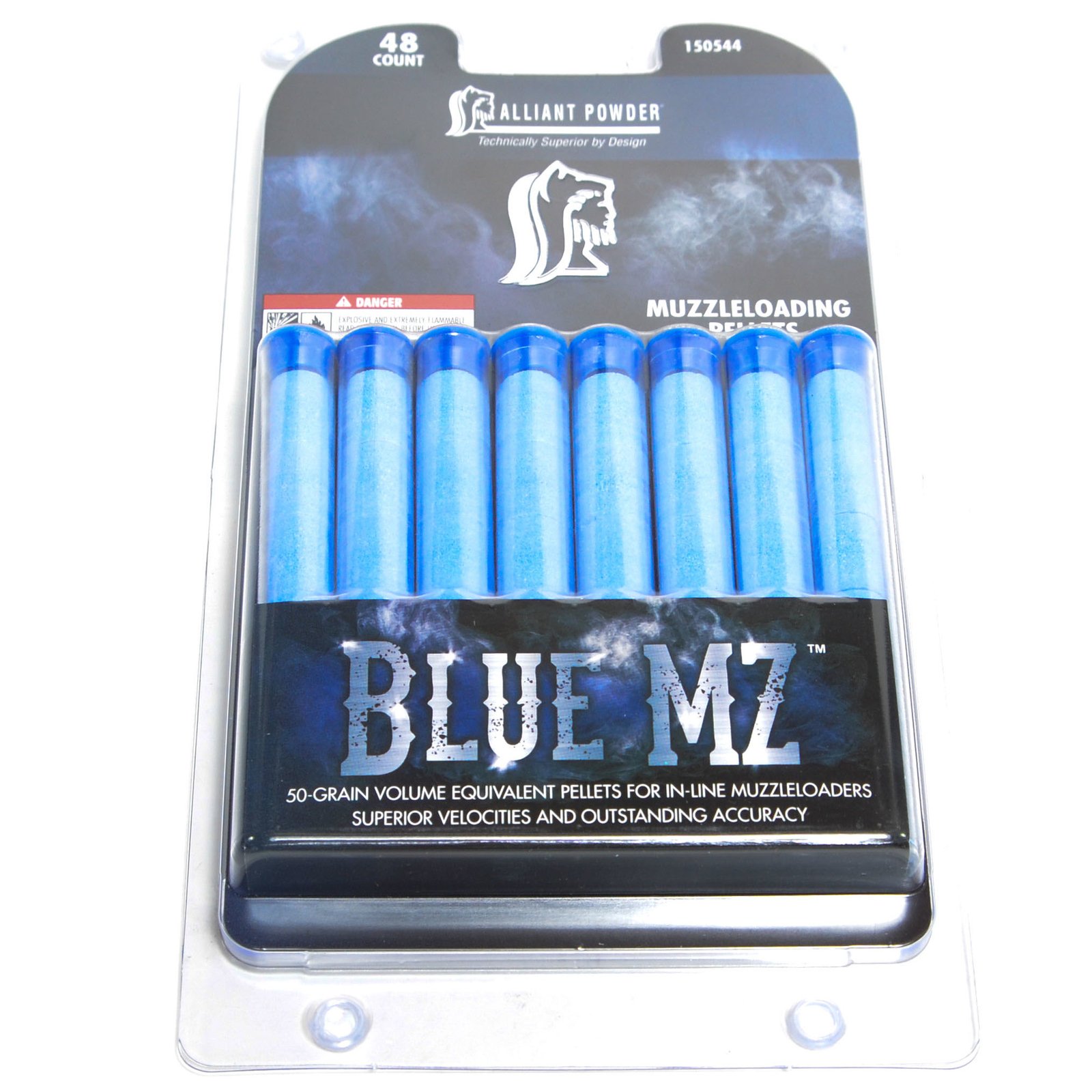 Buy Alliant Blue Muzzleloader 50 Gr Pellets (24) hunters need propellant that ignites reliably and burns consistently even in extreme weather conditions. New Blue MZ from Alliant Powder delivers on this tall order. The 50 grain equivalent pellets produce higher velocities than competing pellets at safe pressures, and ignite reliably with 209 shotshell primers. Blue MZ provides outstanding accuracy with a wide range of popular bullets. The clean burning formulation allows for fast, easy cleaning with water based solvents.