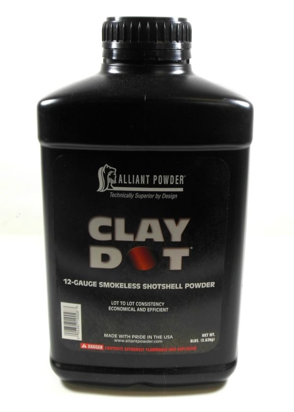 Alliant Clay Dot smokeless shotshell powder 12-gauge shotshell powder. This clean burning shotshell powder was made with 12-gauge sport competition shooters in mind. This 12-gauge shotshell powder is economical, efficient, made in the USA and offers lot to lot consistency.