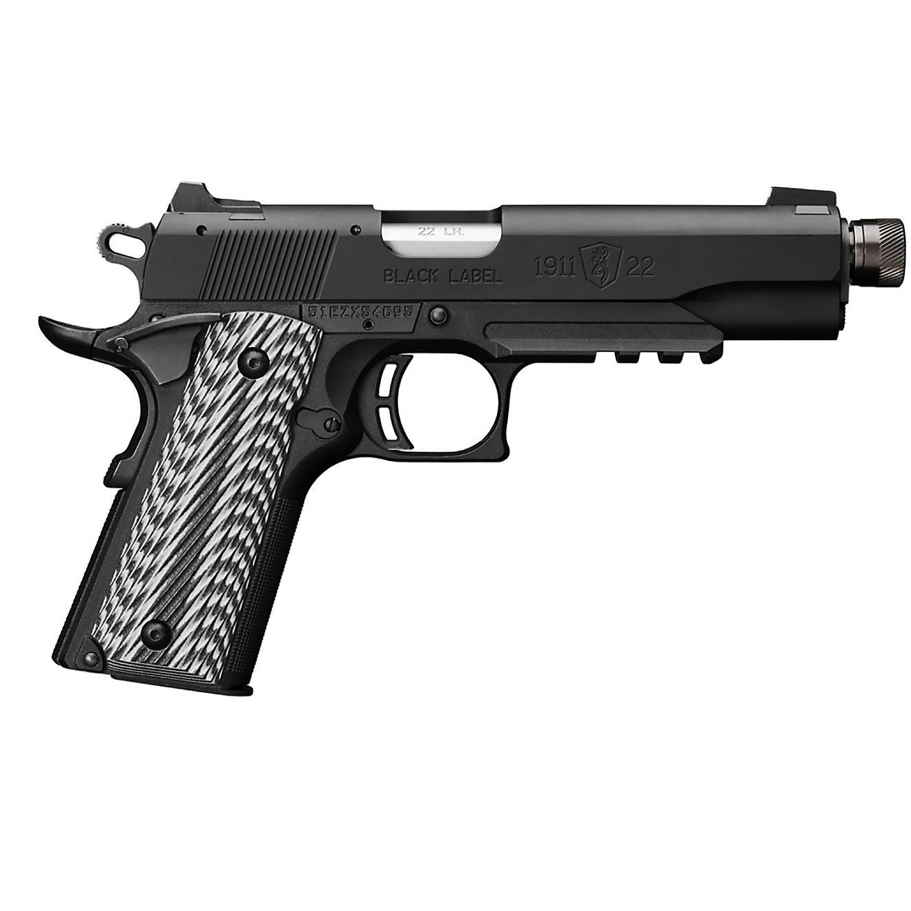 Buy BROWNING 1911 BLACK LABEL SUPPRESSOR-READY .22 LR PISTOL WITH RAIL To begin with, Boasting postmodern style, the Browning 1911 Black Label Suppressor-Ready .22 LR Pistol with Rail comes outfitted with a G10 grip and dovetail combat 3-dot sights. The barrel is threaded and ready to accept a suppressor or silencer. The high-strength frame is made from lightweight aluminum alloy and features both manual and beavertail grip safeties. 1913 Picatinny rail. Includes an ABS storage case and a 10-round magazine.