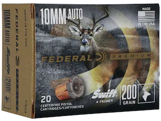 Buy Federal Premium Ammunition 10mm Auto 200 Grain Swift A-Frame Jacketed Hollow Point Box of 20 Quality hunting ammunition designed for maximum performance and reliability. Premium hunting bullets are matched with select powders, primers and brass to create a reliable, hard-hitting hunting cartridge. With its unique cross-member copper jacket design and a bonded front core, the Swift A-Frame has become famous for its ability to combine 3 performance features – controlled expansion, deep penetration and 95% weight retention at all velocities. This ammunition is new production, non-corrosive, in boxer-primed, reloadable brass cases.