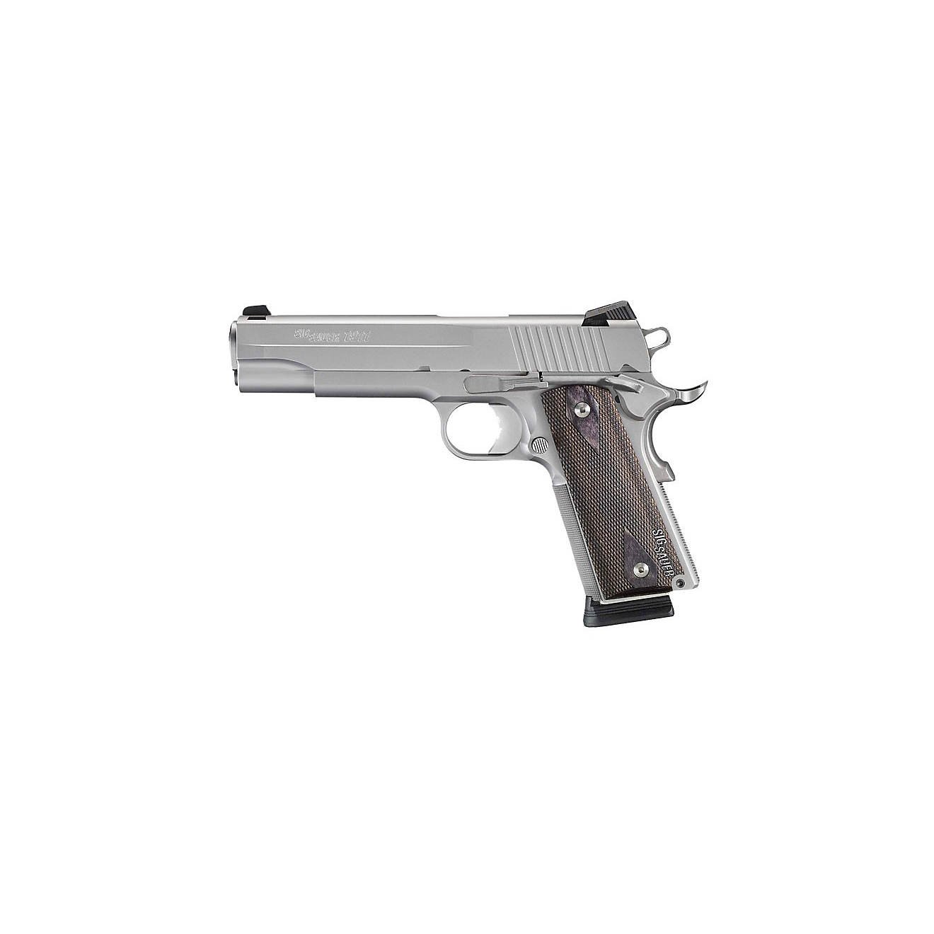 Buy SIG SAUER 1911 STANDARD .45 ACP PISTOL Topped with low-profile night sights, the gun features a steel frame with a stainless finish and a 5-inch barrel. This pistol also features custom blackwood grips and an accessory rail.