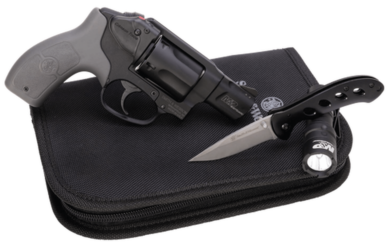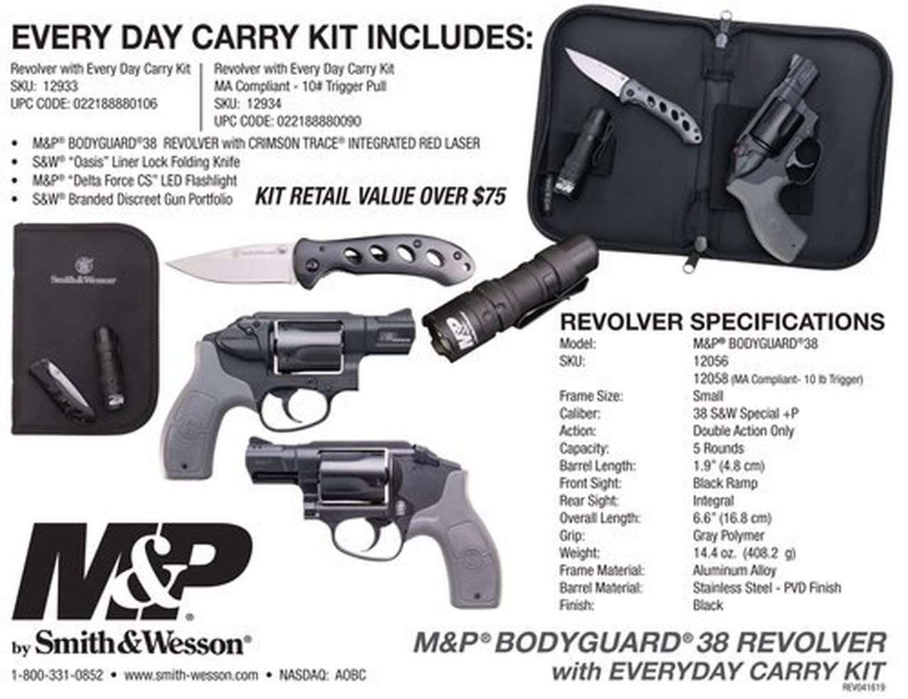 Smith & Wesson, Bodyguard 38, Revolver, Double Action Only, Sub Compact Size, 38 Special +P, 1.9″ Barrel, Aluminum Alloy Frame, Black Finish, Polymer Grips, 5Rd, Every Day Carry Kit Includes Crimson Trace Integrated Red Laser, Carry Case, Delta Force CS Flashlight, S&W Oasis Liner Lock Knife, Weighs 14.4oz, Internal Notch Rear Sight, Blade Front Sight