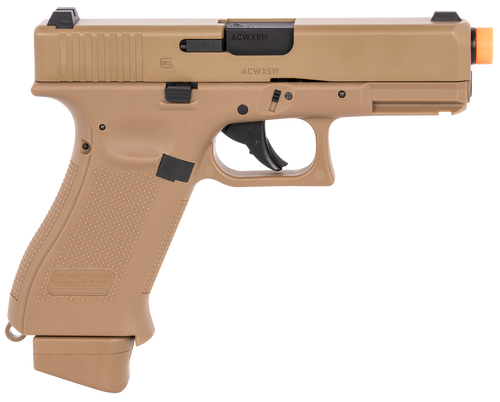 One of GLOCK’s more popular recent models has been the G19X. Providing shooters with a full-size grip and a shorter overall length slide has proven to be a successful recipe. Quick handling, accurate, and full-size handgun capacity have proven to be a winner for GLOCK. This airsoft field safe G19X launches .20 gram airsoft BBs at 300 FPS and holds 14 rounds of 6mm BBs in the drop-free full-size magazine. Like the firearm, this licensed airsoft replica features a Gen 5 slide profile and grip texturing making this version a perfect fit for many shooters. This airsoft pistol is easy to identify with its Coyote tan slide, frame, and magazine extension plate. Officially licensed product of GLOCK.