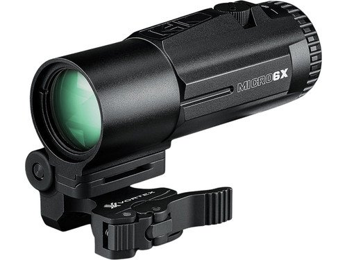 vThe Vortex Micro 6x Magnifier provides easy on, easy off functionality and is built to seamlessly fit onto your rifle. The Micro 6x magnifier delivers an incredibly compact 6x optical system that takes your red dot farther. The Micro 6x features robust functionality in the field, three mount heights to best fit your setup, and an adjustable flip mount that allows for left or right-handed use. The camlock system engages or disengages with direct pressure, allowing you to raise and lower the magnifier quickly and easily.